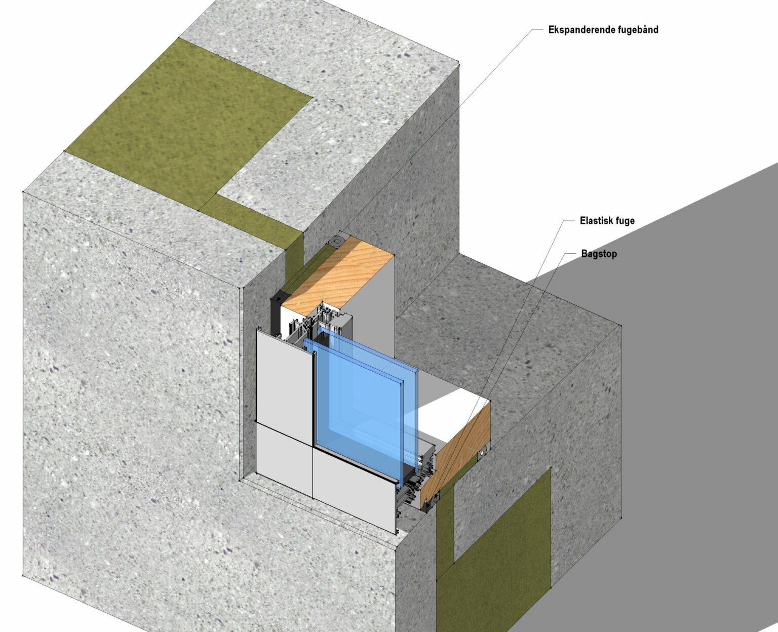 Udvendig regnskærm udføres med komprimeret fugebånd. Indvendig vindtætning udføres med fugemasse med fugeunderlag i fuldstændigt sammenhæng med dampspærre.