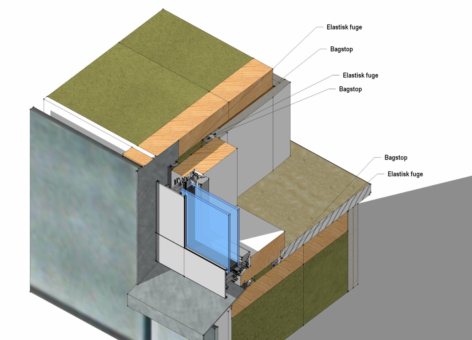 Udvendig regnskærm udføres med fugemasse og fugeunderlag. Indvendig fuge udføres med fugemasse med fugeunderlag i fuldstændigt sammenhæng med dampspærre.
