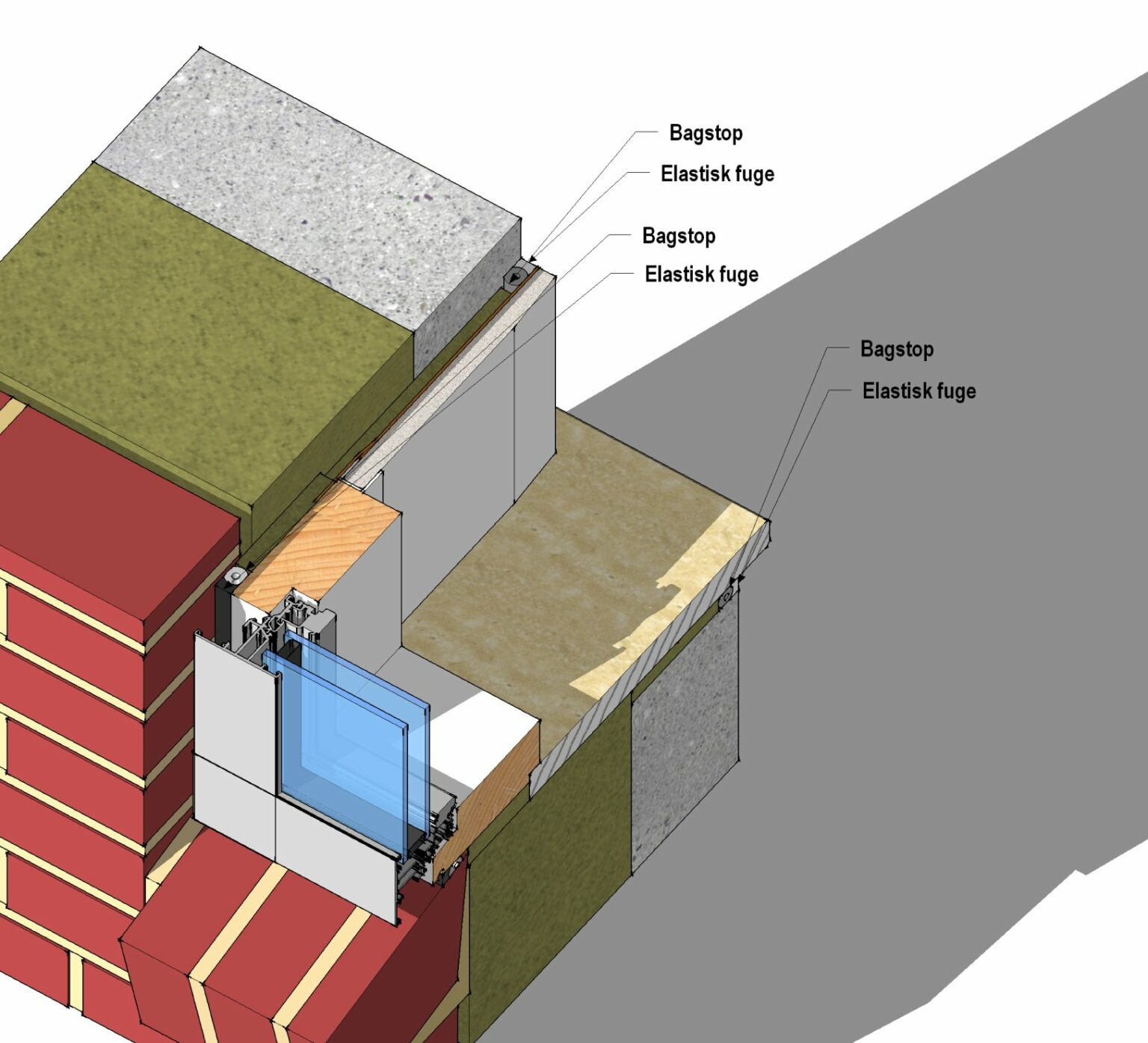 Udvendig regnskærm udføres med fugemasse og fugeunderlag. Indvendig fuge udføres med fugemasse med fugeunderlag i fuldstændigt sammenhæng med dampspærre. Teglfacader betragtes som ventilerede facader og kræver derfor ikke ventileret/drænet fugeløsning.