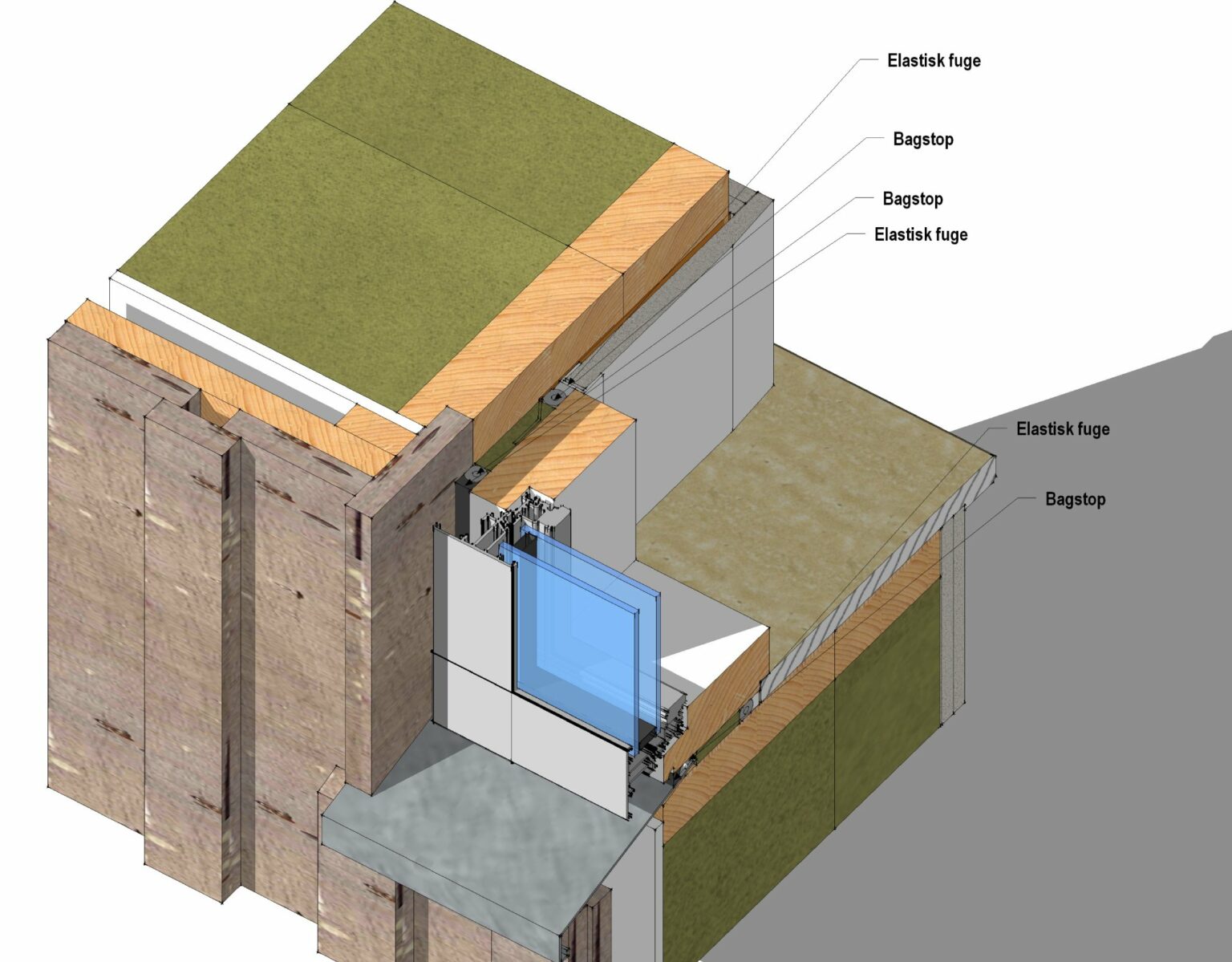Udvendig regnskærm udføres med fugemasse og fugeunderlag. Indvendig fuge udføres med fugemasse med fugeunderlag i fuldstændigt sammenhæng med dampspærre.
