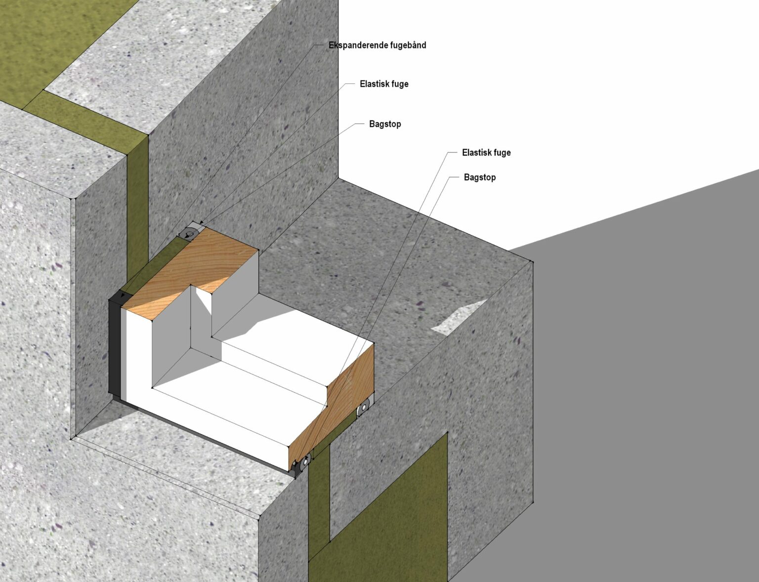 Udvendig regnskærm udføres med komprimeret fugebånd. Indvendig vindtætning udføres med fugemasse med bagstop i fuldstændigt sammenhæng med dampspærre.