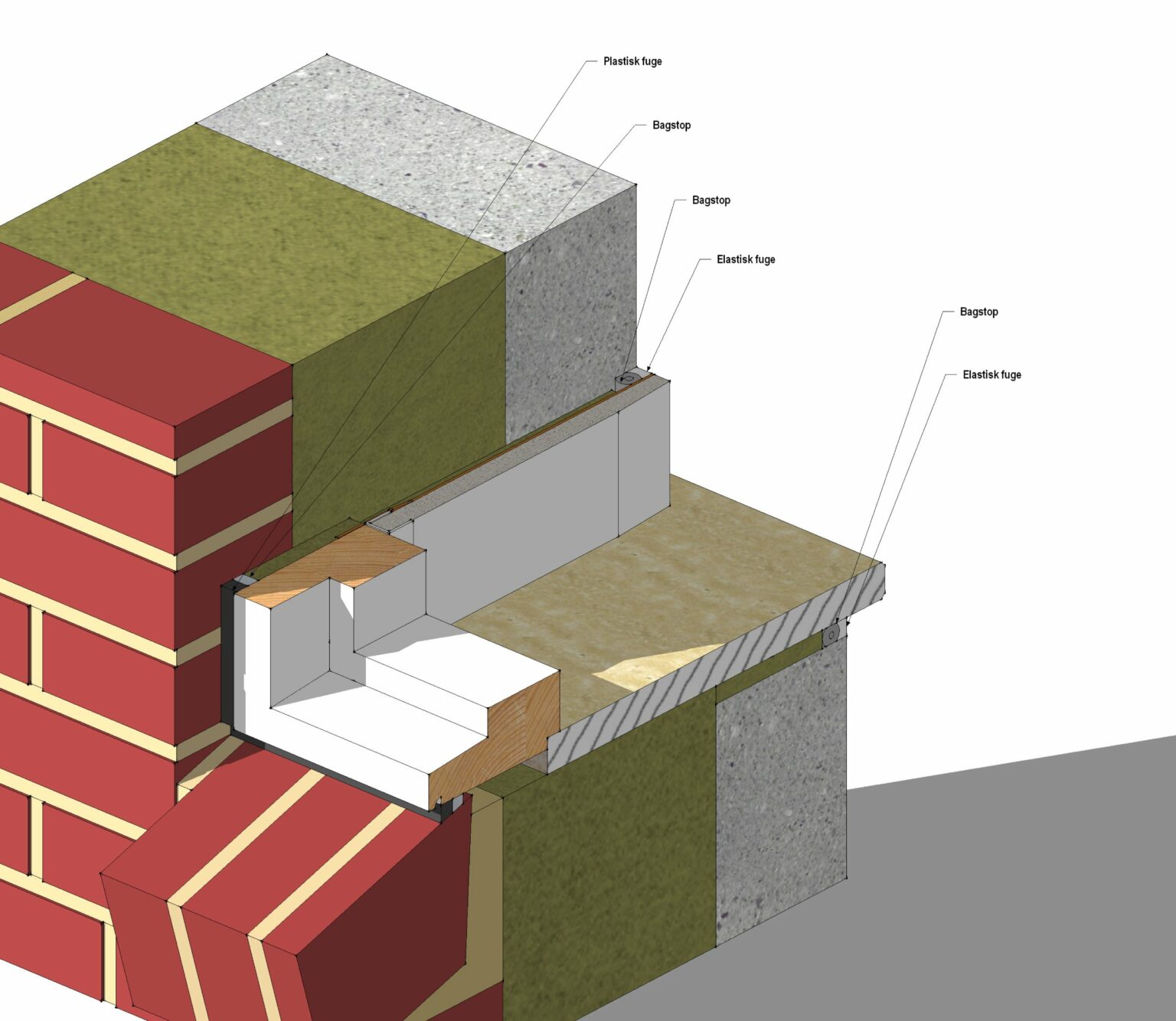 Udvendig regnskærm udføres med fugemasse og bagstop. Indvendig vindtætning udføres med fugemasse med bagstop i fuldstændigt sammenhæng med dampspærre.