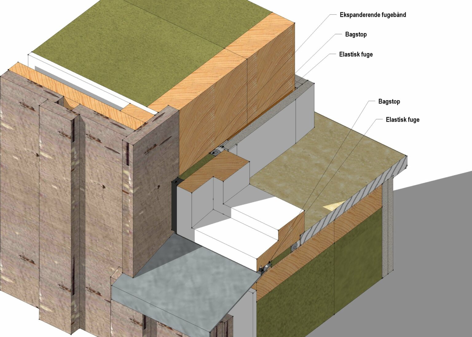 Udvendig regnskærm udføres med komprimeret fugebånd. Indvendig vindtætning udføres med fugemasse med fugeunderlag i fuldstændigt sammenhæng med dampspærre.